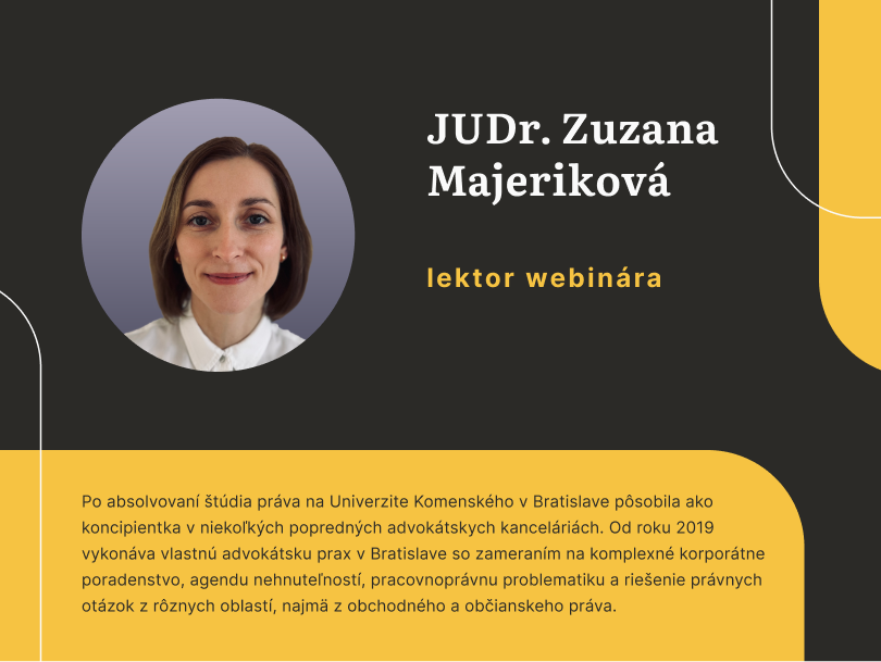 Prednášajúcim bude JUDr. Zuzana Majeriková, ktorá po absolvovaní štúdia práva na Univerzite Komenského v Bratislave pôsobila ako koncipient v niekoľkých popredných advokátskych kanceláriách. Od roku 2019 vykonáva vlastnú advokátsku prax v Bratislave so zameraním na komplexné korporátne poradenstvo, agendu nehnuteľností, pracovnoprávnu problematiku a riešenie právnych otázok z rôznych oblastí, najmä z obchodného a občianskeho práva.